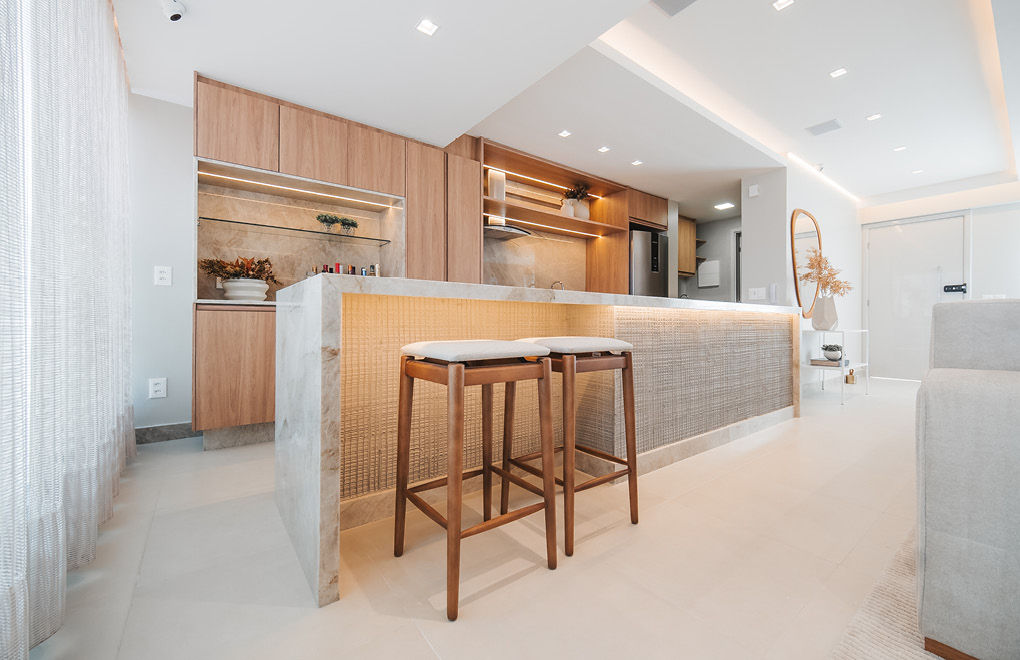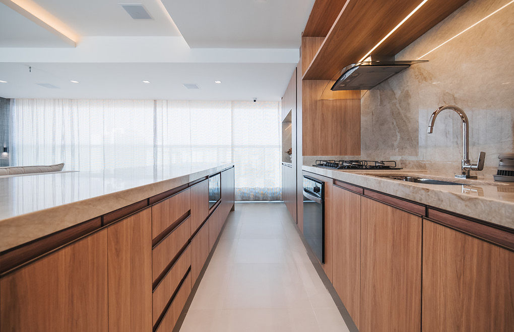 A cozinha gourmet, totalmente aberta para a área de estar, permite que todos acompanhem a preparação dos pratos durante encontros e celebrações. A marcenaria e a escolha cuidadosa dos acabamentos garantem a harmonia entre os