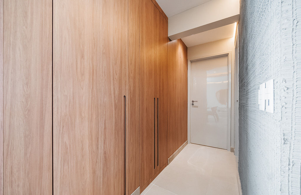 O projeto atende ao desejo do cliente por ambientes amplos, aconchegantes e com um toque de madeira. Para isso, a varanda foi integrada com a sala e cozinha, e os espaços dos quartos foram readequados, incluindo um closet na suíte master, para criar um projeto conciso, contemporâneo e cheio de charme.